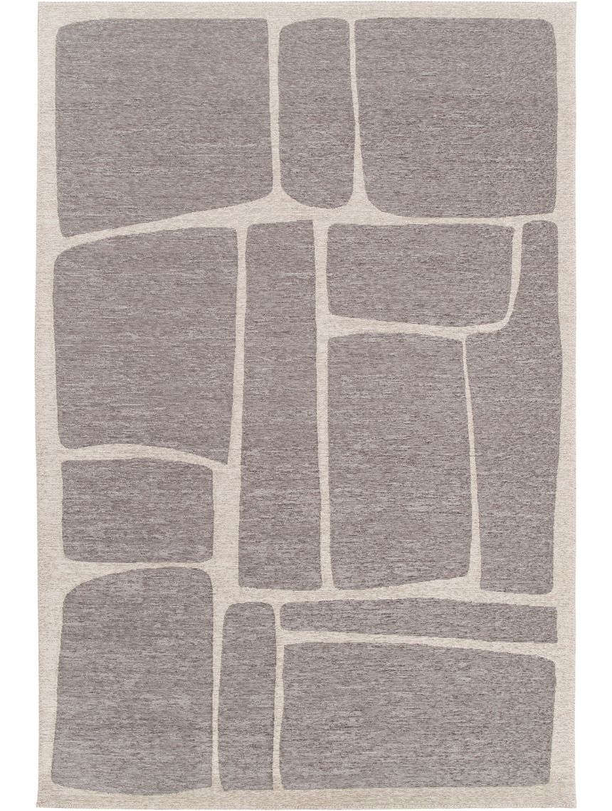 Nuestra alfombra moderna Cloe presenta un llamativo diseño abstracto que evoca un patrón de adoquines o bloques de piedra de formas irregulares y orgánicas, separadas por líneas más claras que simulan la junta. La paleta de colores es sobria y elegante, dominada por un tono gris topo o marrón grisáceo para los bloques y un beige muy claro o crema para el fondo y las líneas divisorias. La textura parece ser de pelo corto o tejido plano, ofreciendo un acabado contemporáneo y versátil, ideal para añadir un toque de sofisticación geométrica y calidez neutra a cualquier espacio interior, como una sala, comedor u oficina. Su estética minimalista pero con carácter la convierte en una pieza central discreta