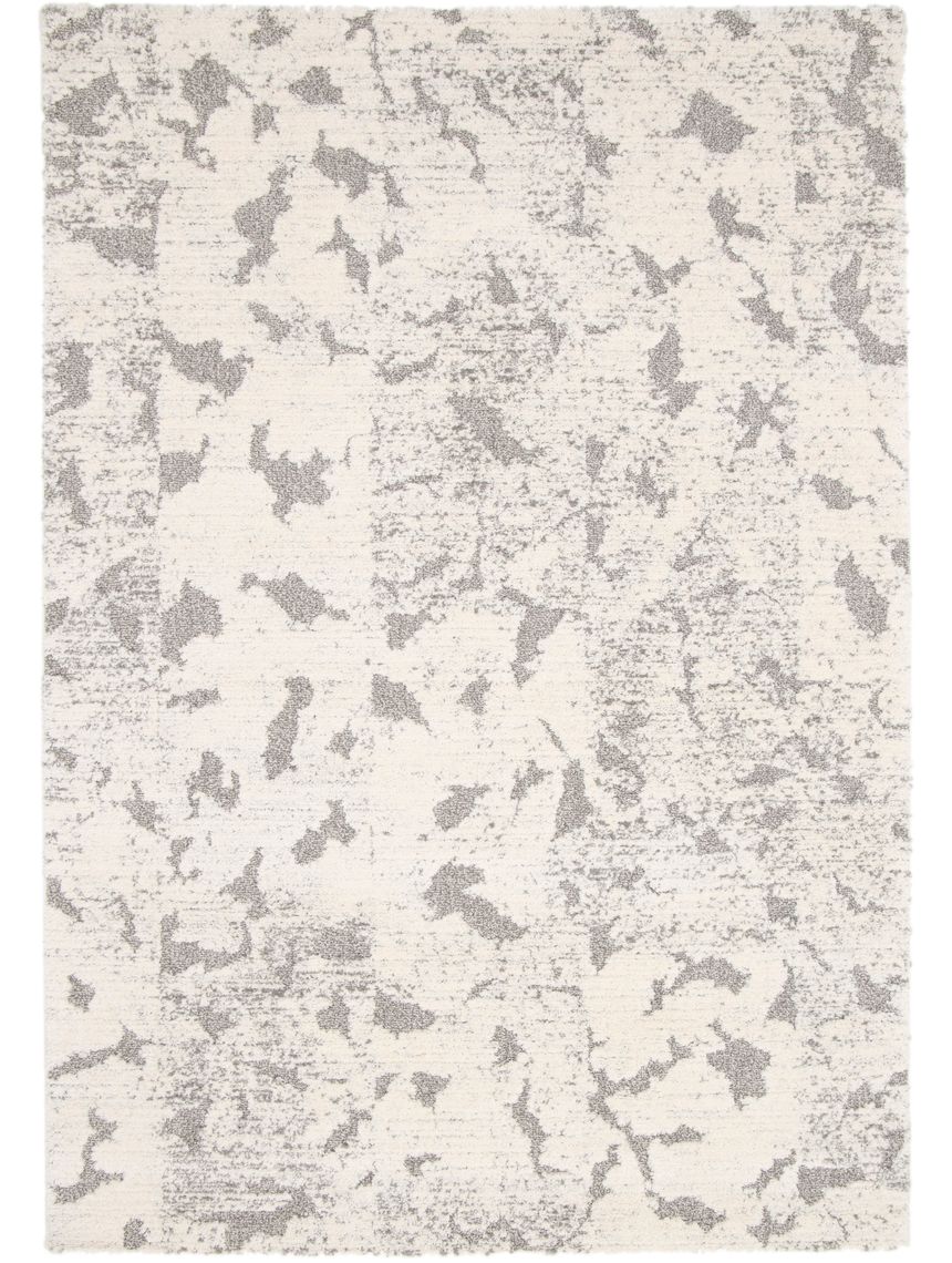 Esta alfombra de estilo abstracto moderno presenta un patrón dinámico de manchas o formas irregulares que se distribuyen aleatoriamente sobre su superficie, evocando un efecto de pátina o desgaste artístico. La paleta de colores es serena y minimalista, dominada por un fondo de blanco roto o crema muy claro, sobre el cual las manchas se presentan en un suave tono beige grisáceo o topo. El contraste sutil y la irregularidad del diseño le confieren un toque de originalidad y sofisticación. Es una pieza versátil, ideal para añadir textura, calidez y un punto focal discreto a cualquier espacio, como un salón, dormitorio o estudio, complementando decoraciones nórdicas, urbanas o contemporáneas