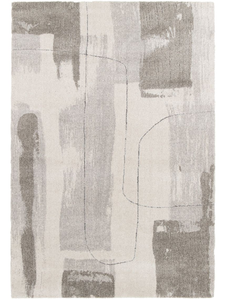 Esta alfombra de estilo abstracto y artístico presenta un diseño dinámico que evoca pinceladas o manchas de pintura, con formas irregulares superpuestas. La paleta de colores es serena y sofisticada, dominada por tonos grises variados, desde el claro al oscuro, y un fondo de blanco roto o crema. Finas líneas oscuras dibujadas a mano atraviesan y conectan algunos de los bloques de color, añadiendo una dimensión orgánica y gestual. Su estética recuerda a la pintura abstracta contemporánea, aportando una sensación de movimiento y creatividad. Es una pieza ideal para añadir personalidad, textura y un punto focal moderno a cualquier salón, estudio o dormitorio con un estilo ecléctico o vanguardista