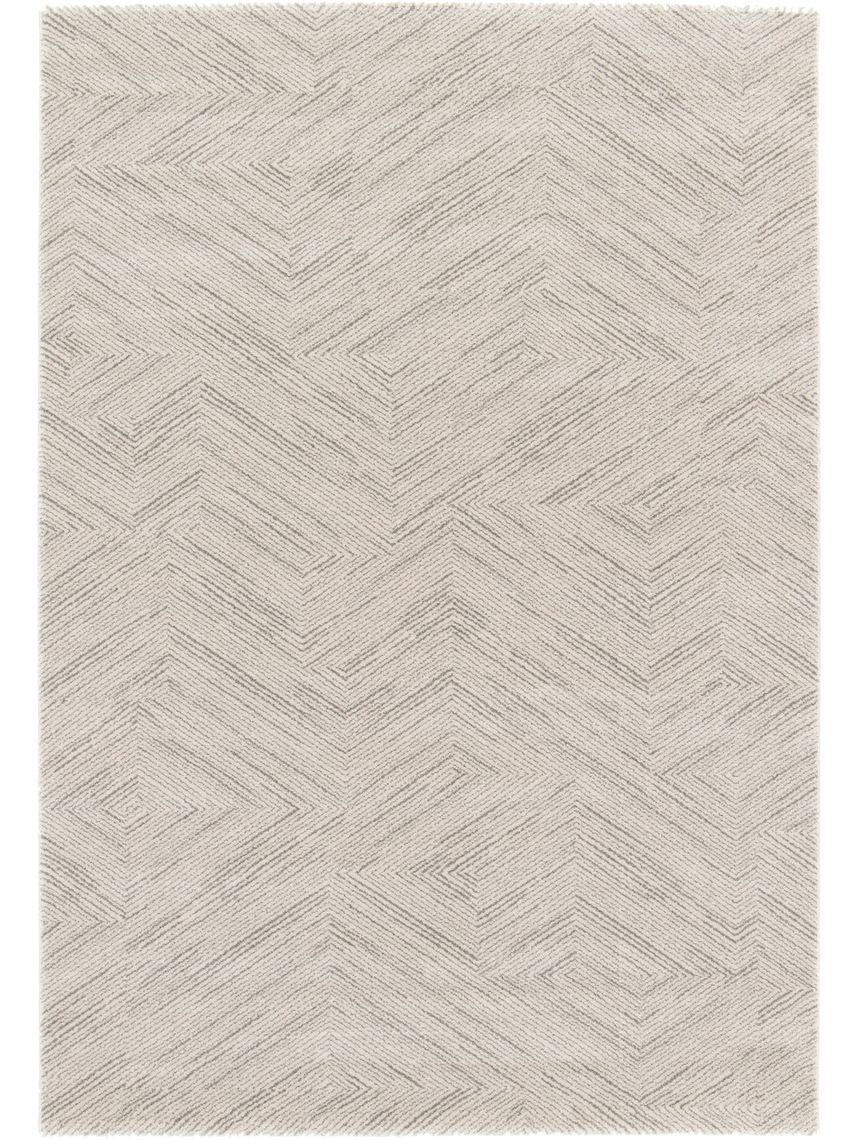 Esta alfombra contemporánea presenta un cautivador diseño geométrico abstracto que evoca una serie de patrones en zigzag, creando una sensación de movimiento y dinamismo. La paleta de colores es sutil y neutral, dominada por un elegante crema como base, sobre la cual el patrón se dibuja con líneas finas en un tono de gris claro. La textura parece ser de pelo corto, lo que acentúa la claridad del diseño. Es una pieza versátil, ideal para añadir interés visual, modernidad y una sutil energía a cualquier espacio, como un salón, oficina o dormitorio, manteniendo un ambiente sereno y sofisticado