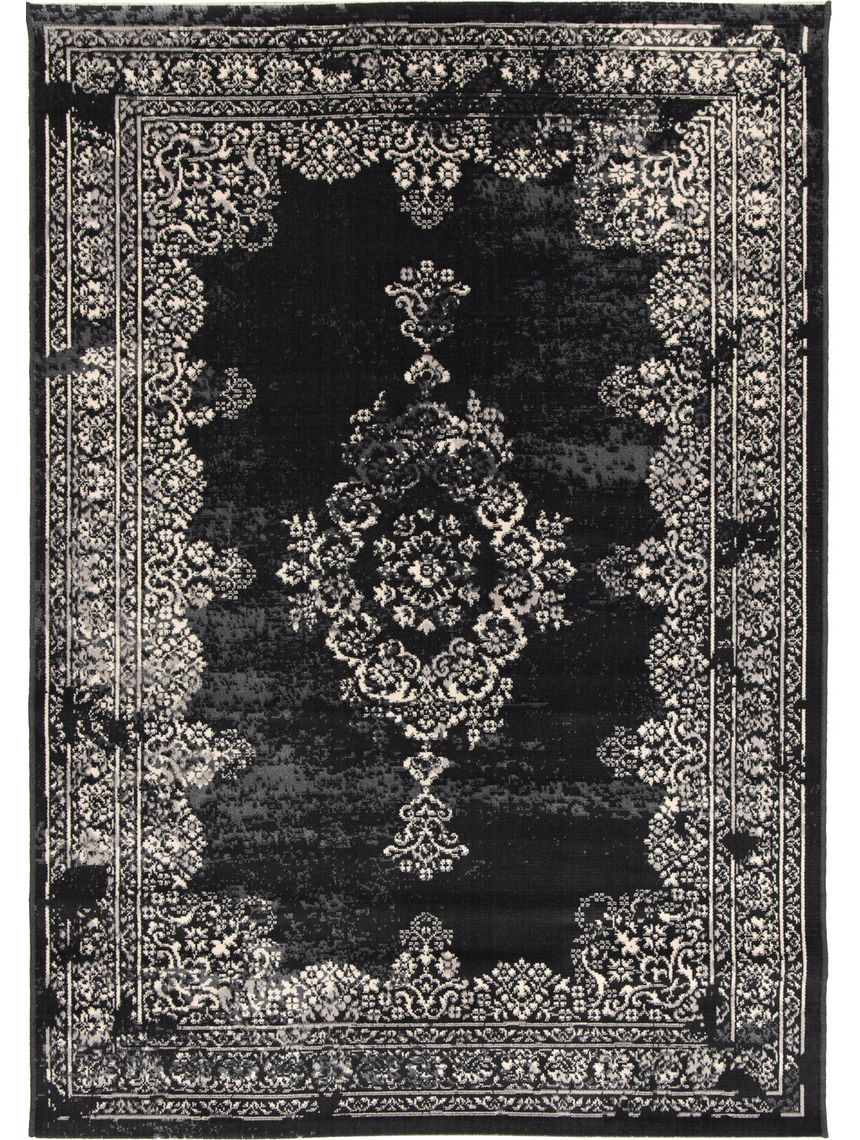 Esta alfombra de estilo persa moderno reinterpreta un diseño clásico con una estética audaz y contemporánea. Presenta un medallón central ornamentado y un borde floral intrincado, todo en una sorprendente combinación de negro profundo y blanco crudo. El contraste dramático se acentúa con un efecto desgastado o distressed sutil, que añade profundidad y una pátina vintage. Su diseño rico en detalles y su paleta monocromática la convierten en una pieza impactante, ideal para crear un punto focal en espacios modernos, industriales o eclécticos. Aporta sofisticación, elegancia atemporal y un toque de misterio a cualquier salón, dormitorio o comedor